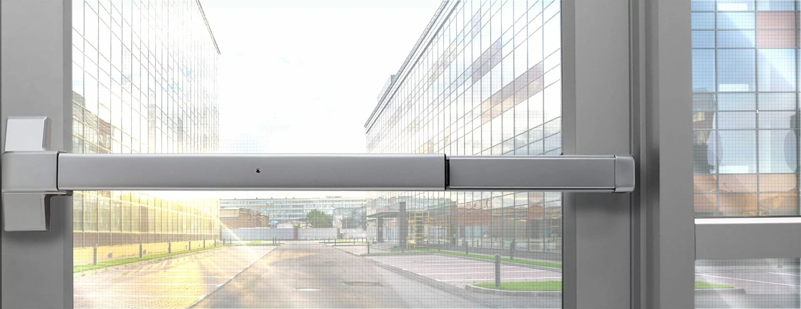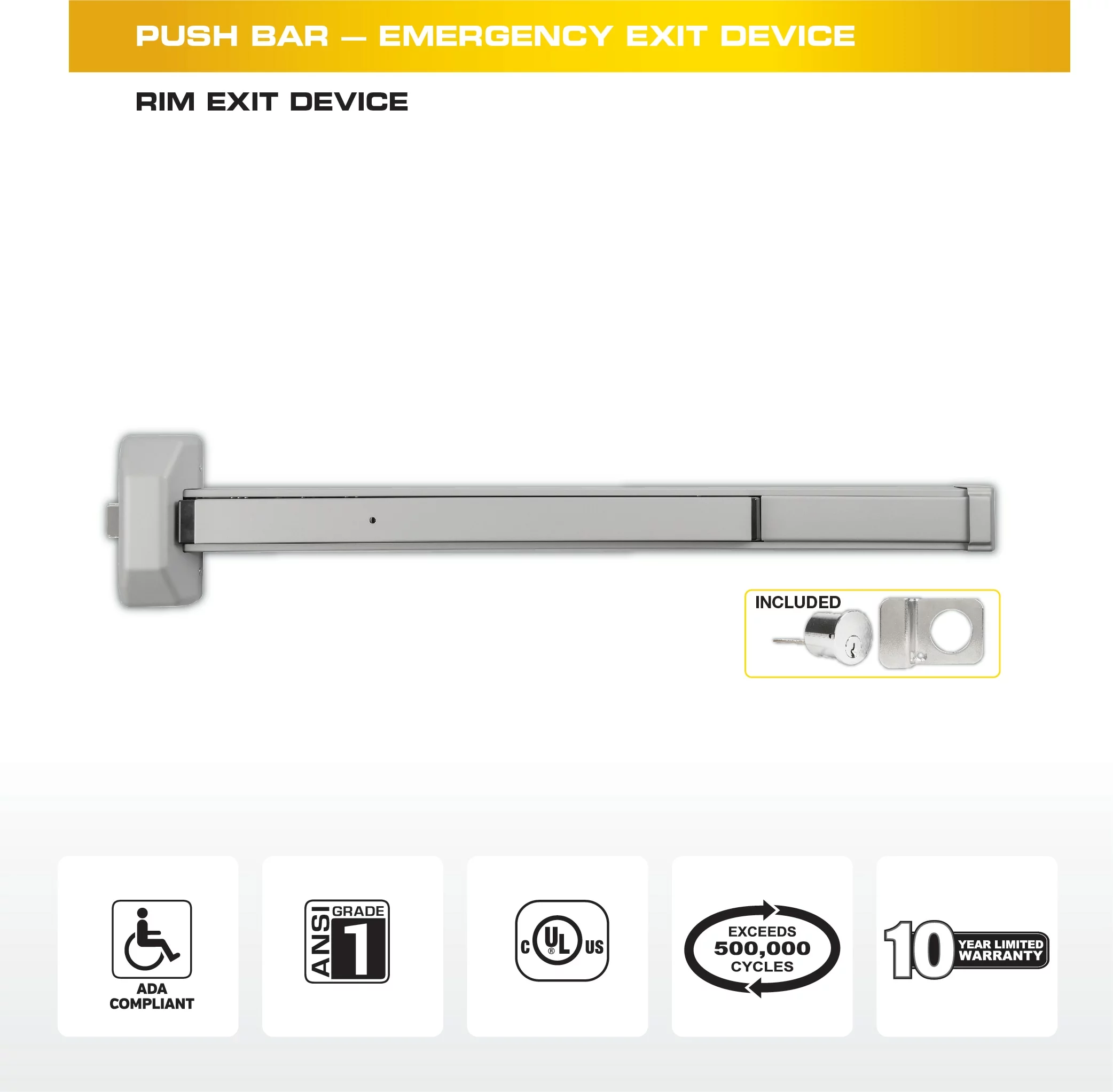 Brinks Commercial rim exit device with standard pull and cylinder is designed specifically for heavy use. It is versatile in its application as it can be installed in a multitude of ways and door facings. This exit device includes everything needed to install and use, including the rim cylinder and a small steel pull plate.