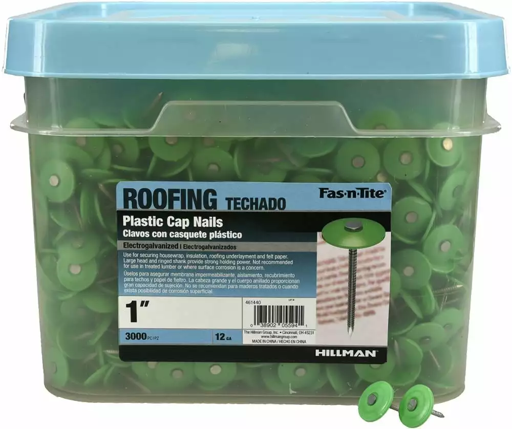 Manufactured for quick and easy installation, electro-galvanized plastic cap roofing nails are ideal for fastening roofing felt, house wrap, sheathing, underlayment, and more. The ringed shank and wide round head on this nail provide superior holding power for reliable installation. Its capped-head helps seal out moisture that can penetrate sidewall, thereby reducing blow-offs and lateral slippage. The electro-galvanized finish on this nail provides superior rust and corrosion protection. Install with confidence as its sharp point easily pierces felt without ripping and the flexible plastic head conforms to surfaces. Because of its wide head and tight hold, fewer nails are needed to get the job done. Use this fastener with a plastic cap roofing nailer.