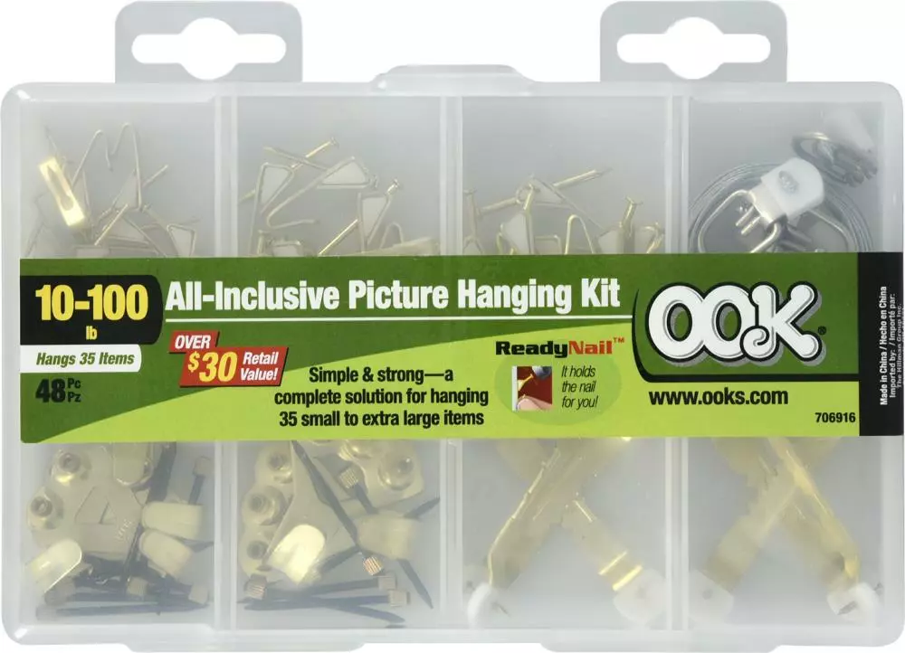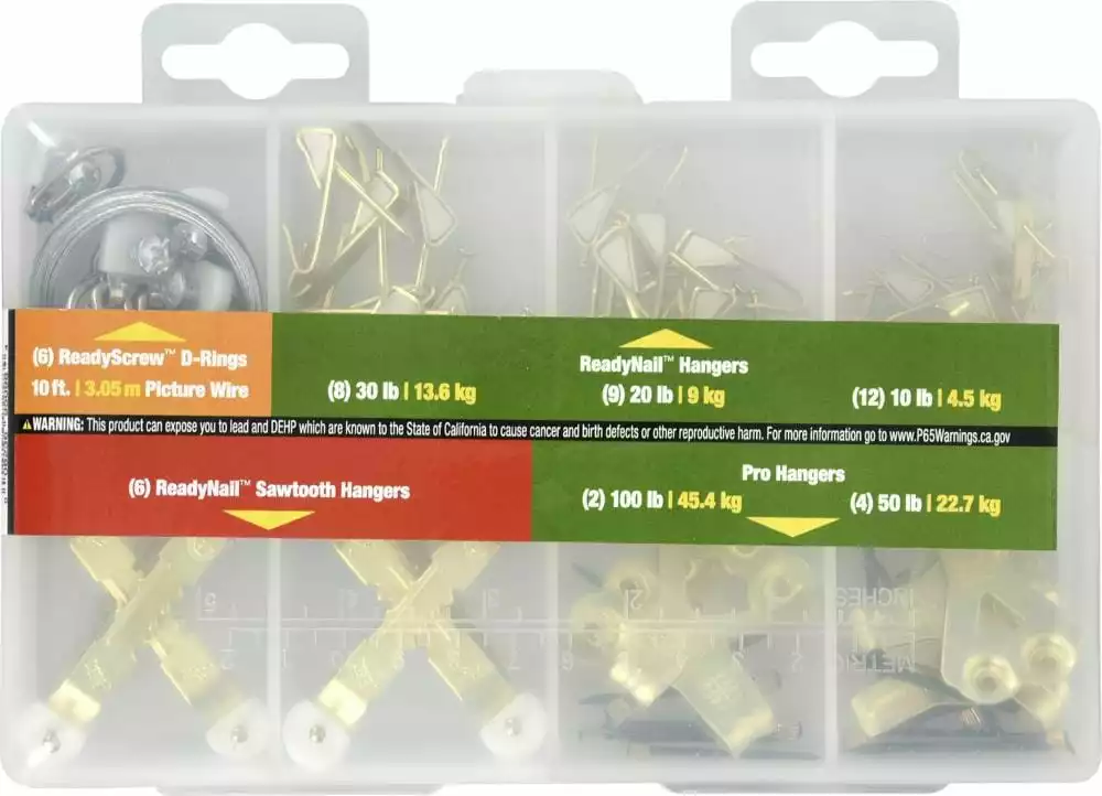 - This kit includes (2)large ReadyNail sawtooth hangers, (4)medium ReadyNail sawtooth hangers, (2)100lb brass hangers, (4)50lb brass hangers, ( 6)D-ring hangers, (1)spool of picture hanging wire, (12)10lb conventional hangers, (9)20lb conventional hangers