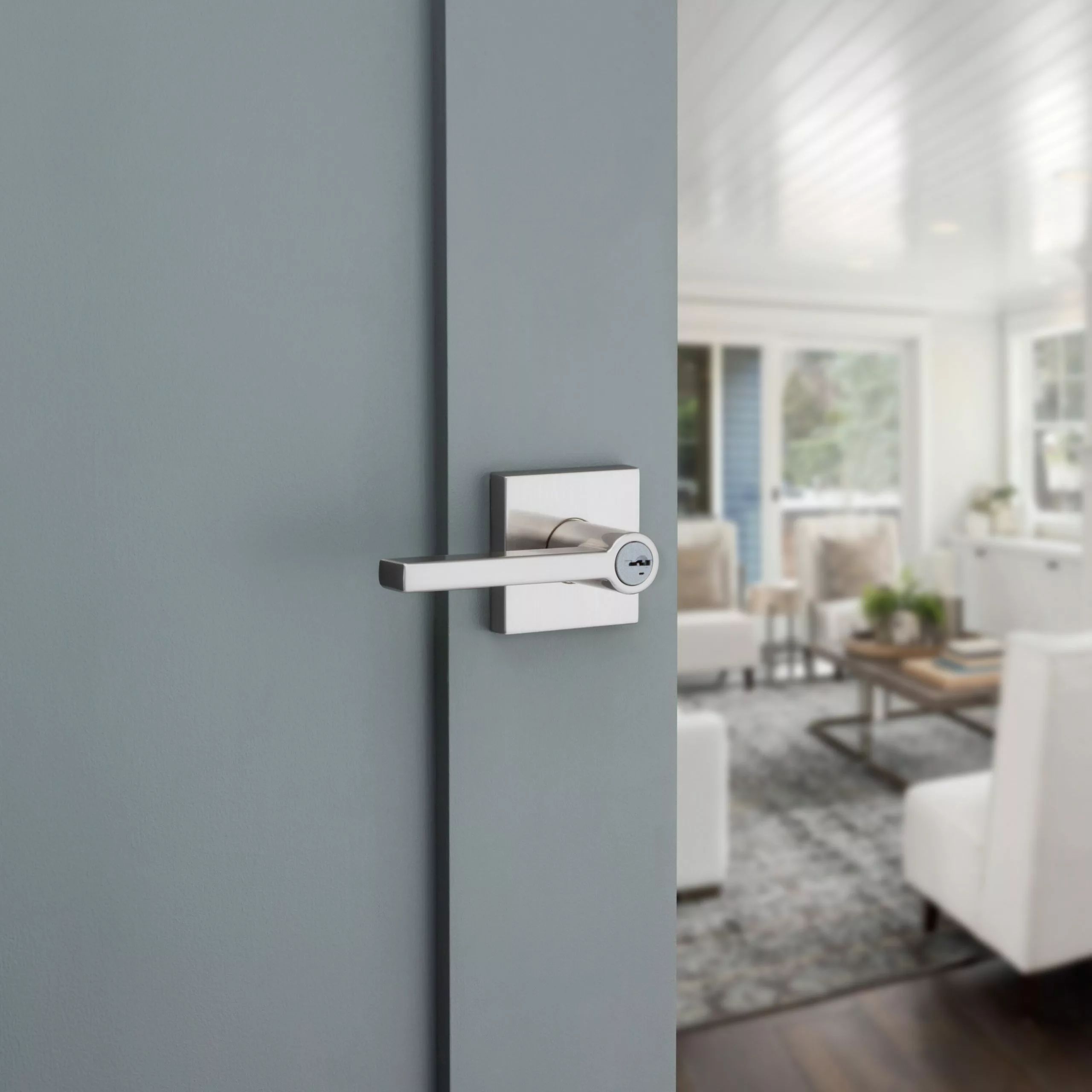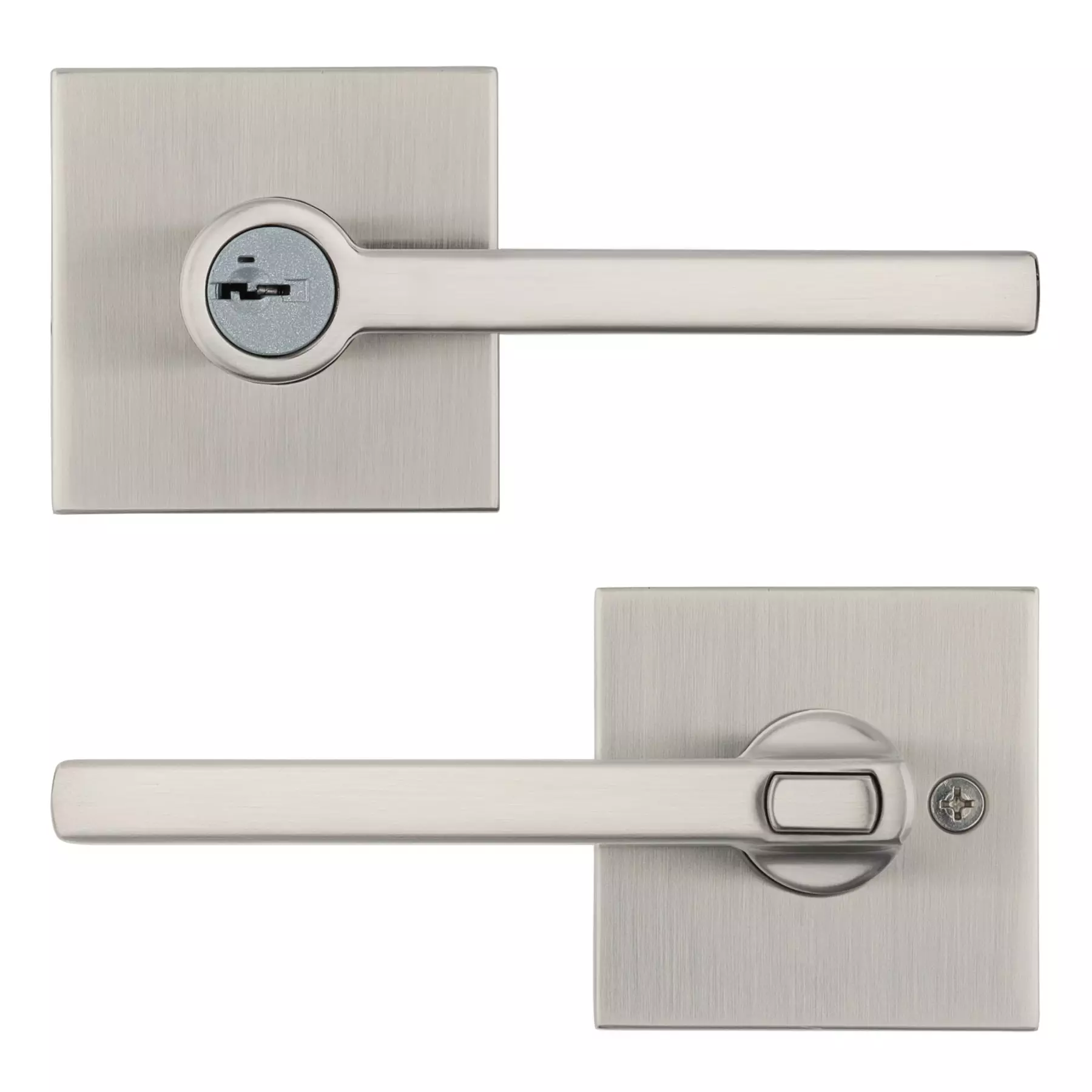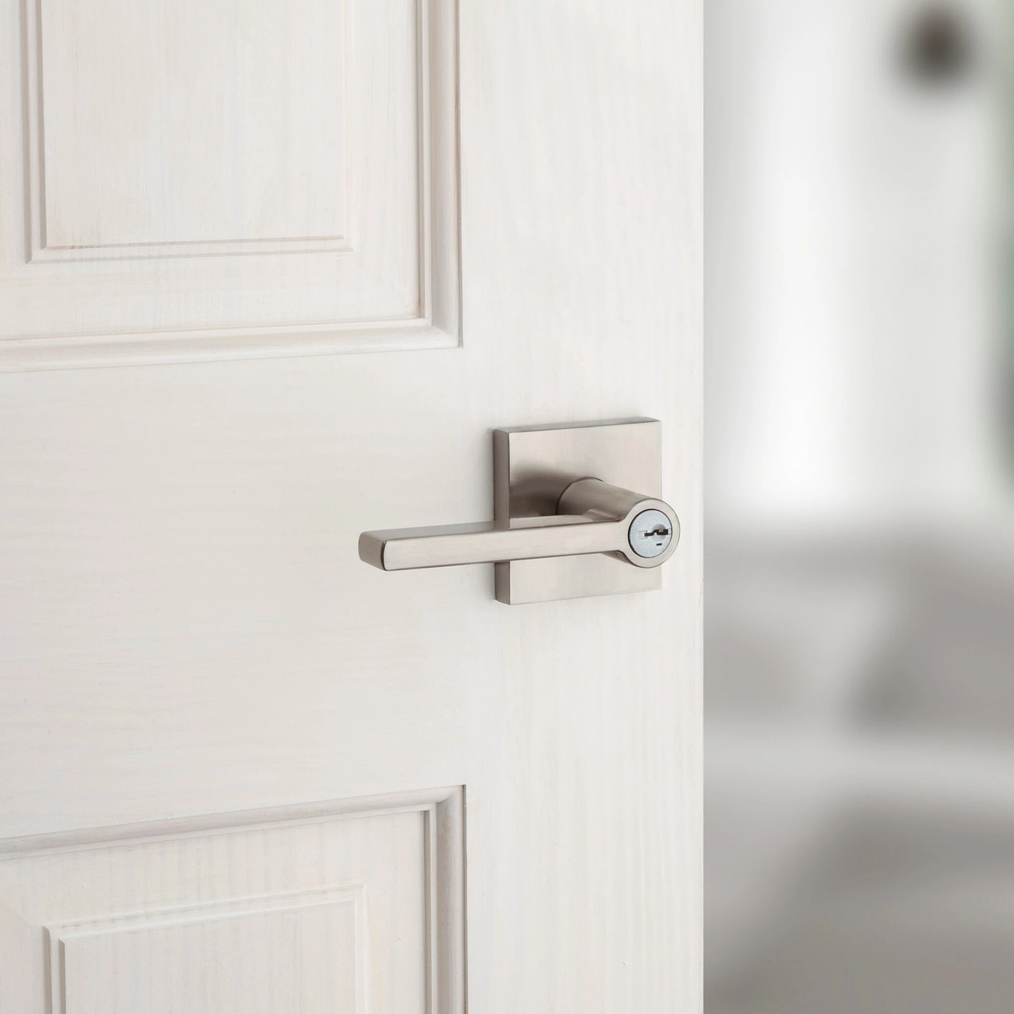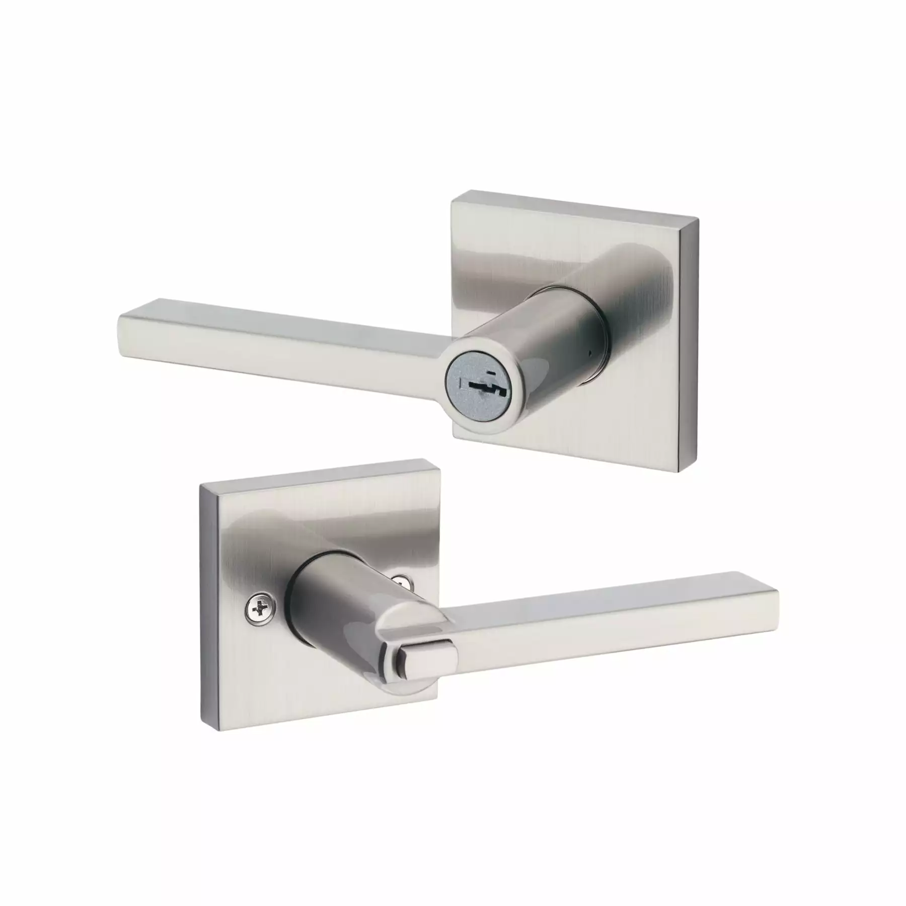 Step up to designer styles and superior security with Kwikset Signature Series products. Halifax combines sophistication and simplicity, making this design the ideal accent for a Contemporary home. Both knobs/levers can be locked or unlocked by a key on the outside, or push button on the inside. The crisp, clean appearance of the satin nickel finish adds to the overall look of the product and brings a modern feel.