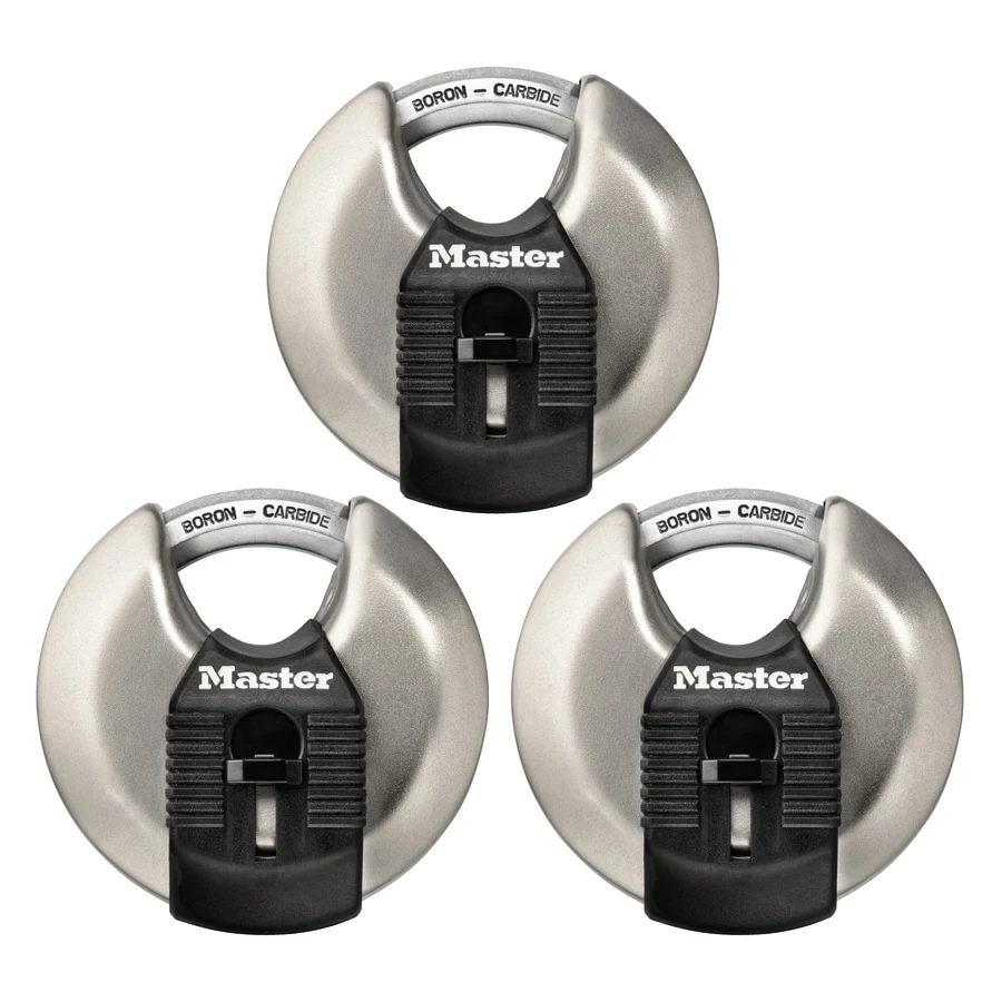 The Master Lock Magnum® M40XT discus padlocks with keys feature a 2-3/4 in. (70 mm) wide stainless steel body for maximum strength, reliability and corrosion resistance. The fully shrouded design minimizes shackle exposure and protects against bolt cutter attacks. The 3/8 in. (10 mm) diameter octagonal shackle is 5/8 in. (16 mm) long and made of Tough-Cut™ boron-carbide, 50% harder than hardened steel, offering maximum resistance to cutting and sawing. The 4-pin cylinder prevents picking and the dual locking ball bearings provide maximum resistance against prying and hammering. The covered keyway offers maximum weather protection, and reinforced body bumper protects against scratches. The lifetime guarantee provides peace of mind from a brand you know and can trust.