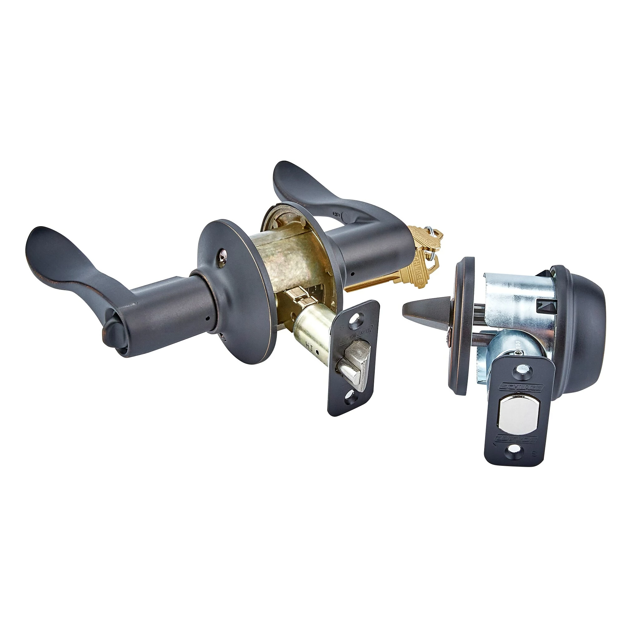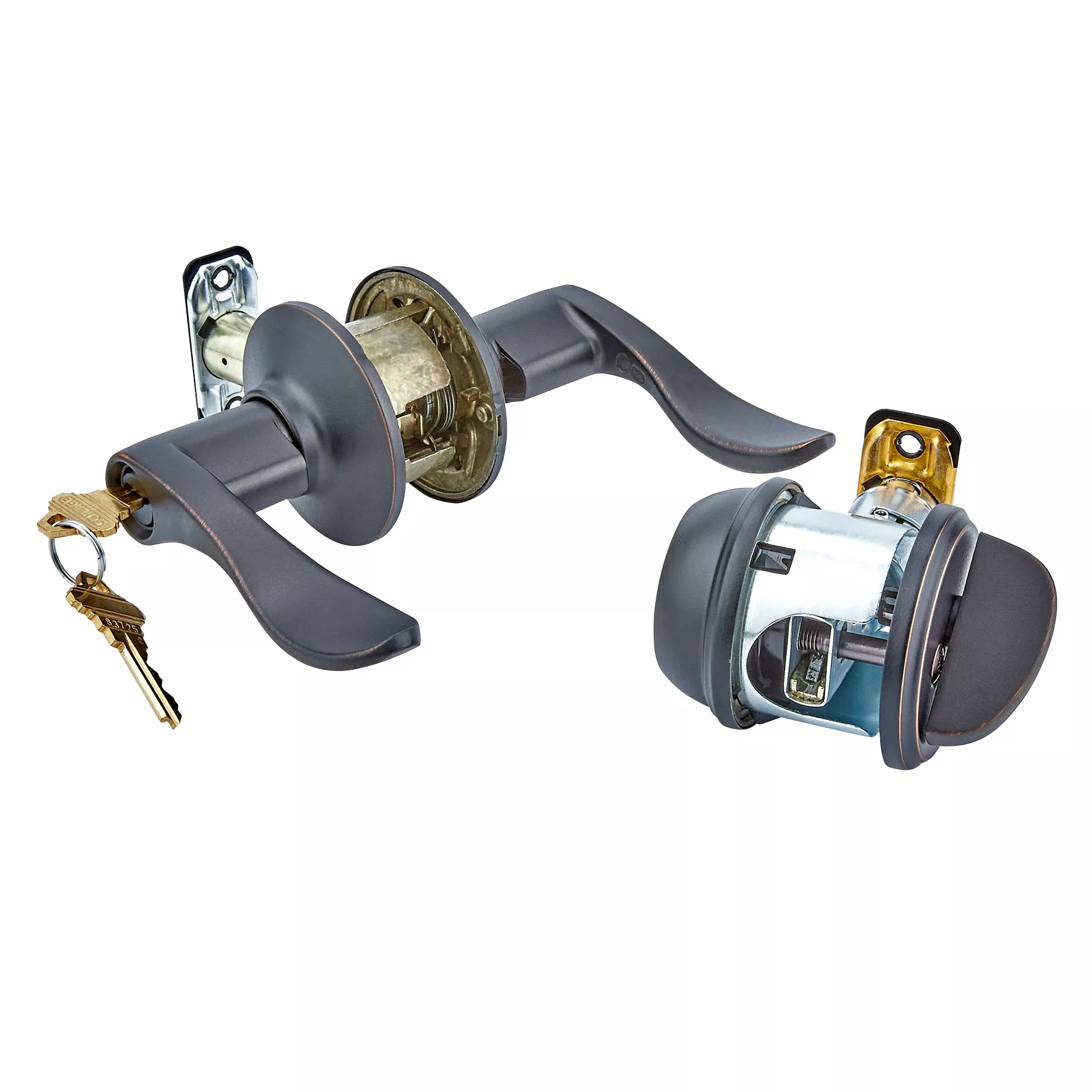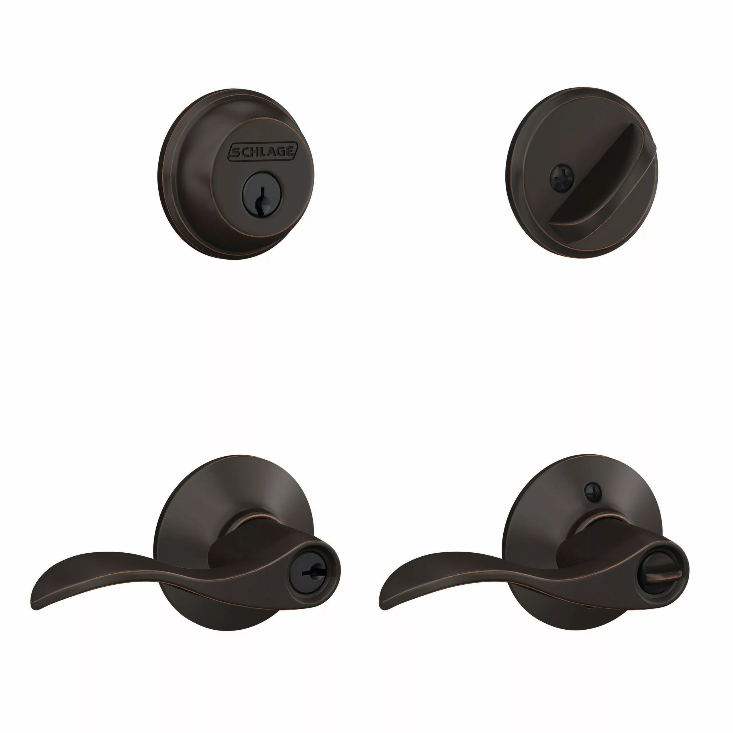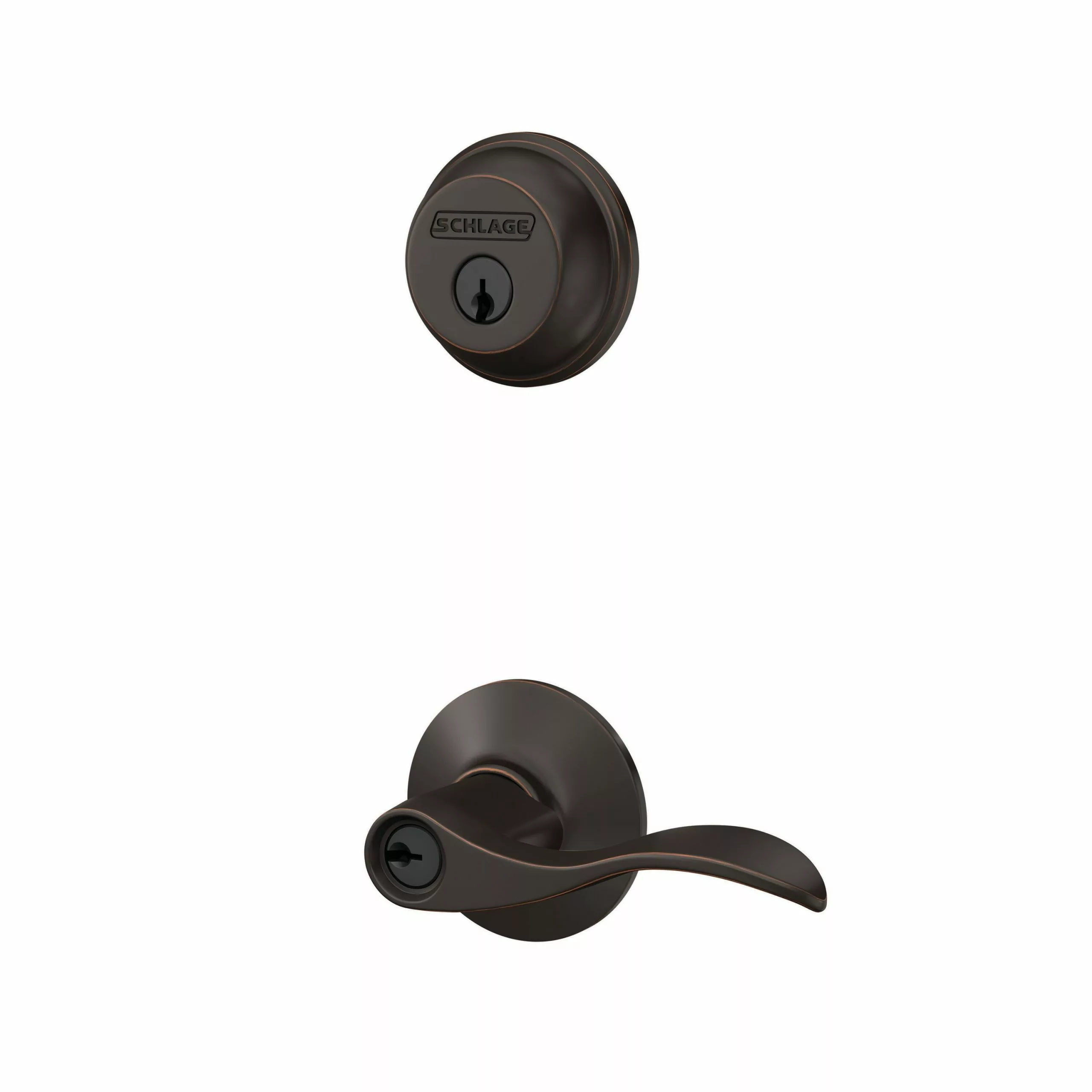 The Schlage single cylinder deadbolt and keyed entry Accent lever in aged bronze is perfect for use on exterior doors, with the deadbolt adding an extra layer of security to the Lever. The Accent lever is widely popular for its elegant wave-like design that effortlessly matches a room’s style without overshadowing it. When finished in aged bronze, the deadbolt and Lever feature warm, copper tones that break through a darker, aged exterior. Plus, it’s been designed and tested with strength and durability in mind.