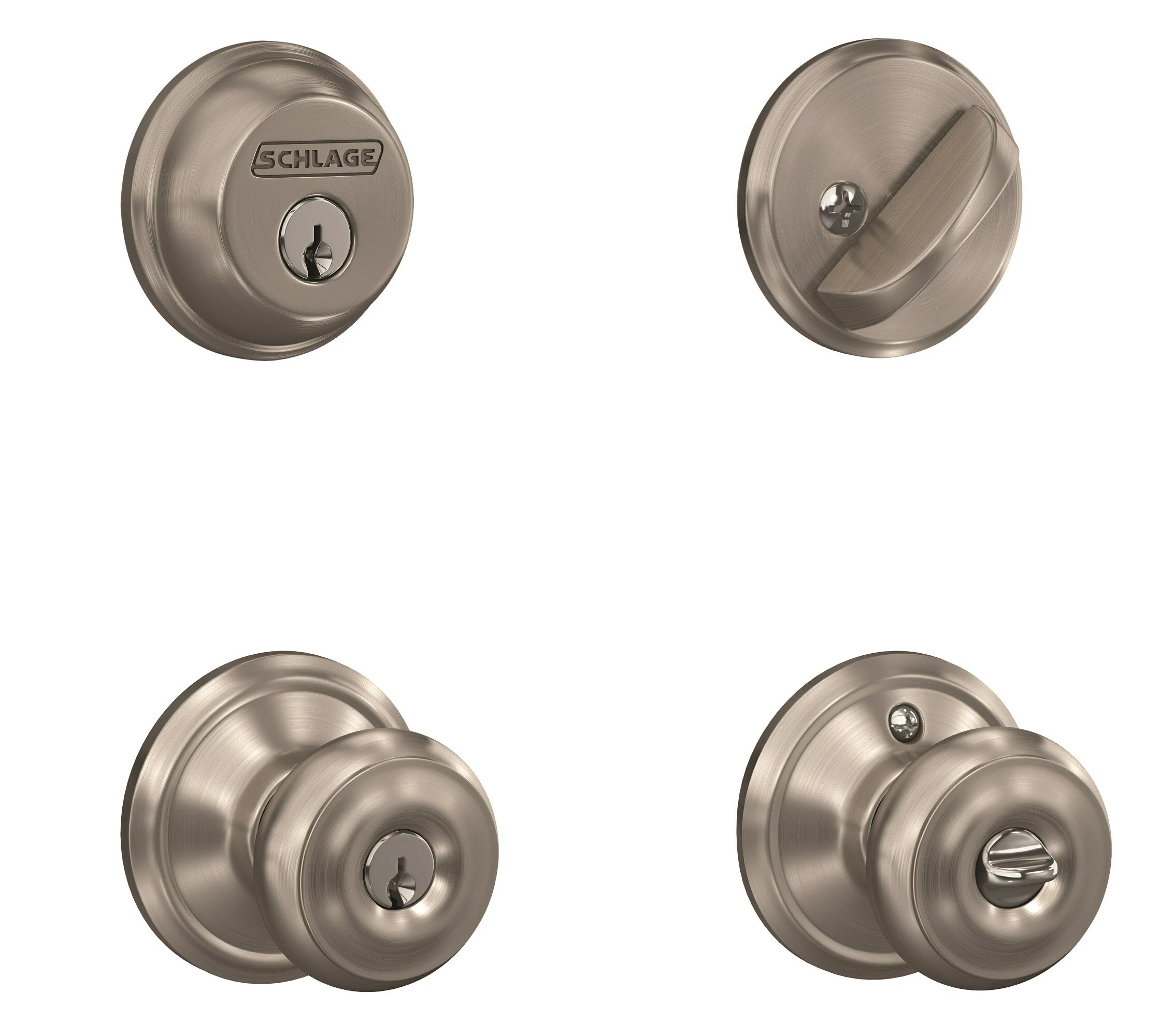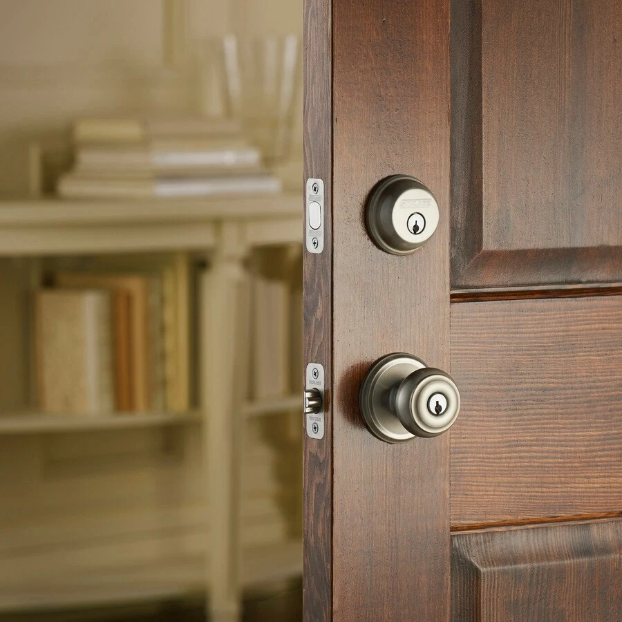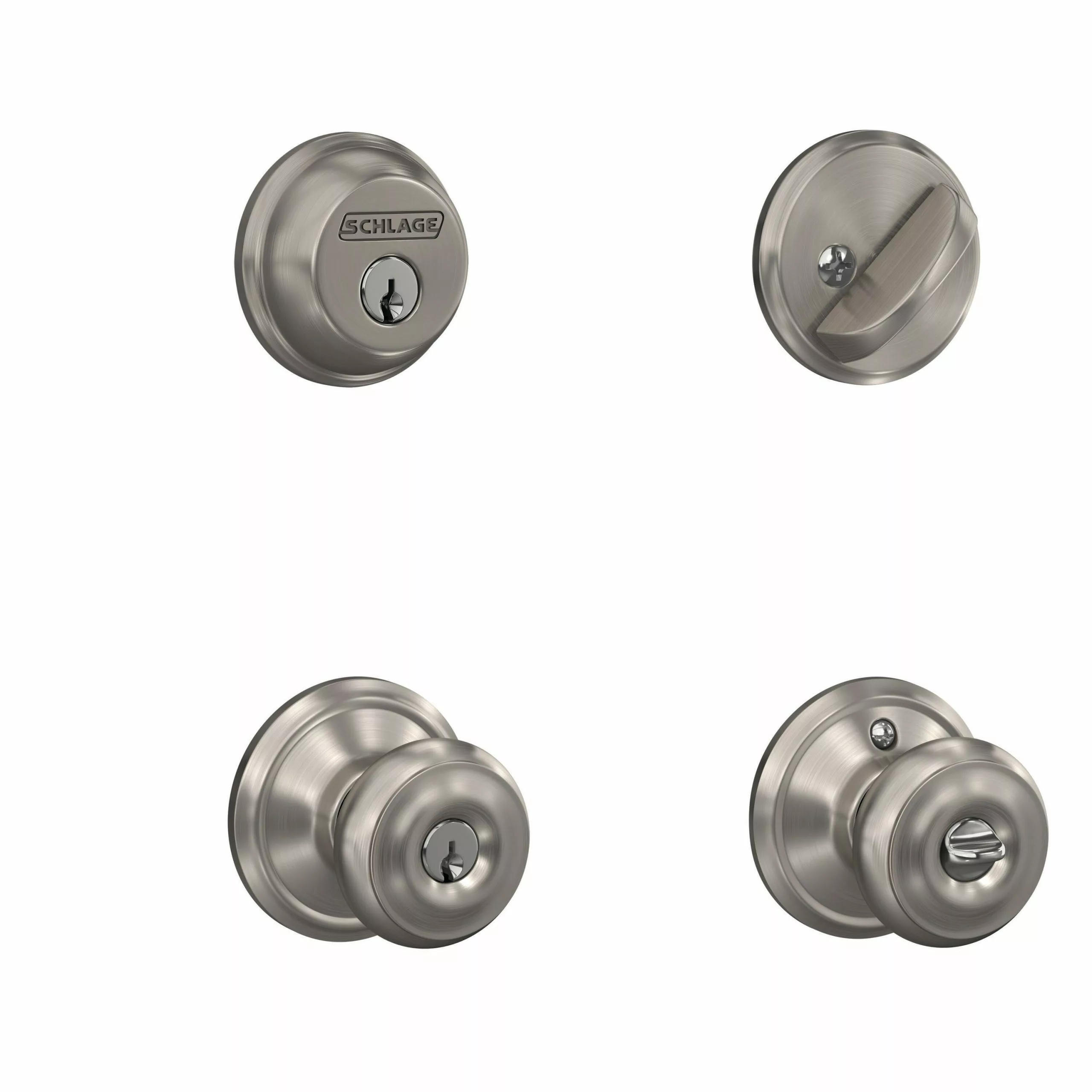 The Schlage single cylinder deadbolt with keyed entry Georgian knob in Satin Nickel is perfect for use on exterior doors, with the deadbolt adding an extra layer of security to the knob. The Georgian knob features symmetrical detailing throughout, and is especially popular in our versatile Satin Nickel finish. Plus, it’s been designed and tested with strength and durability in mind.