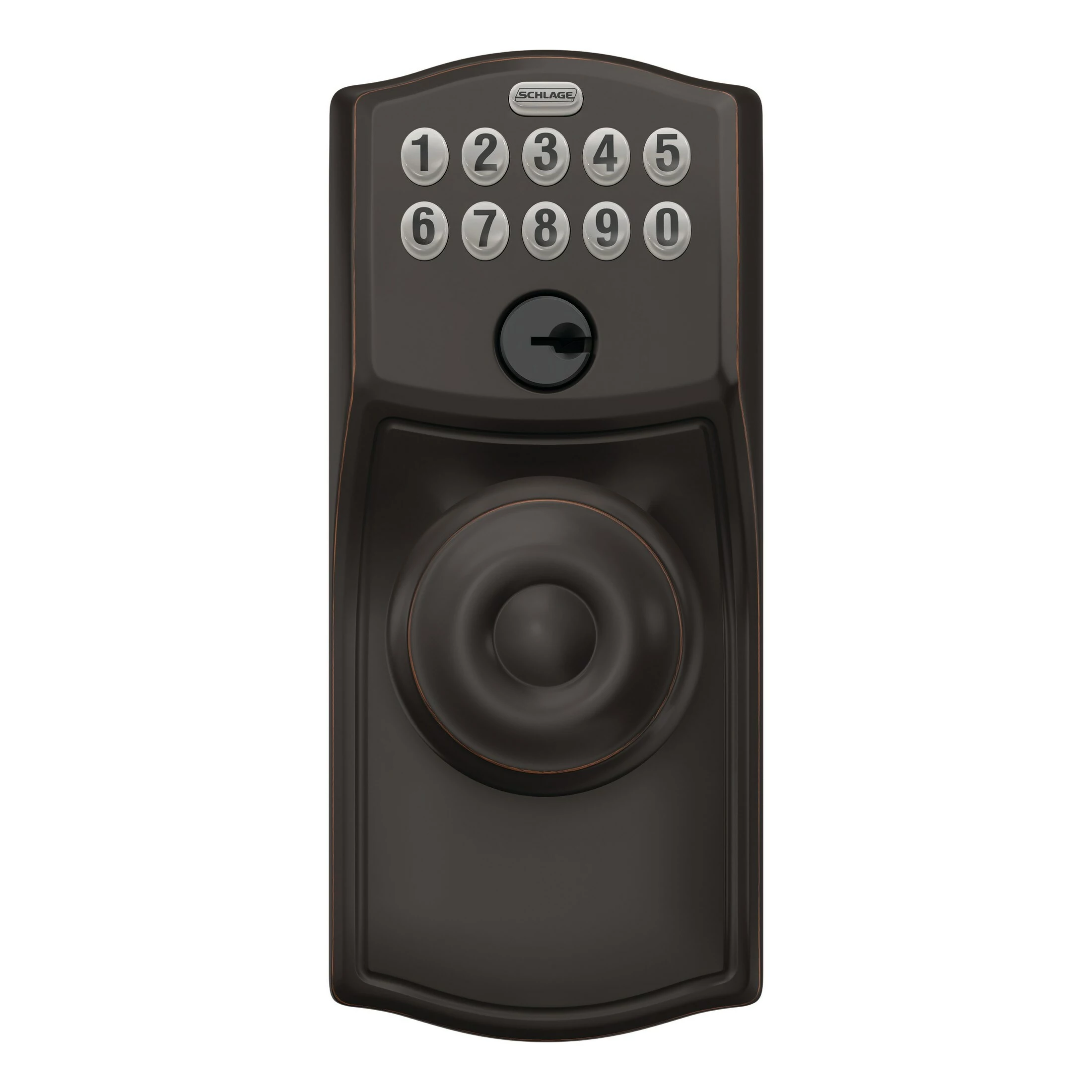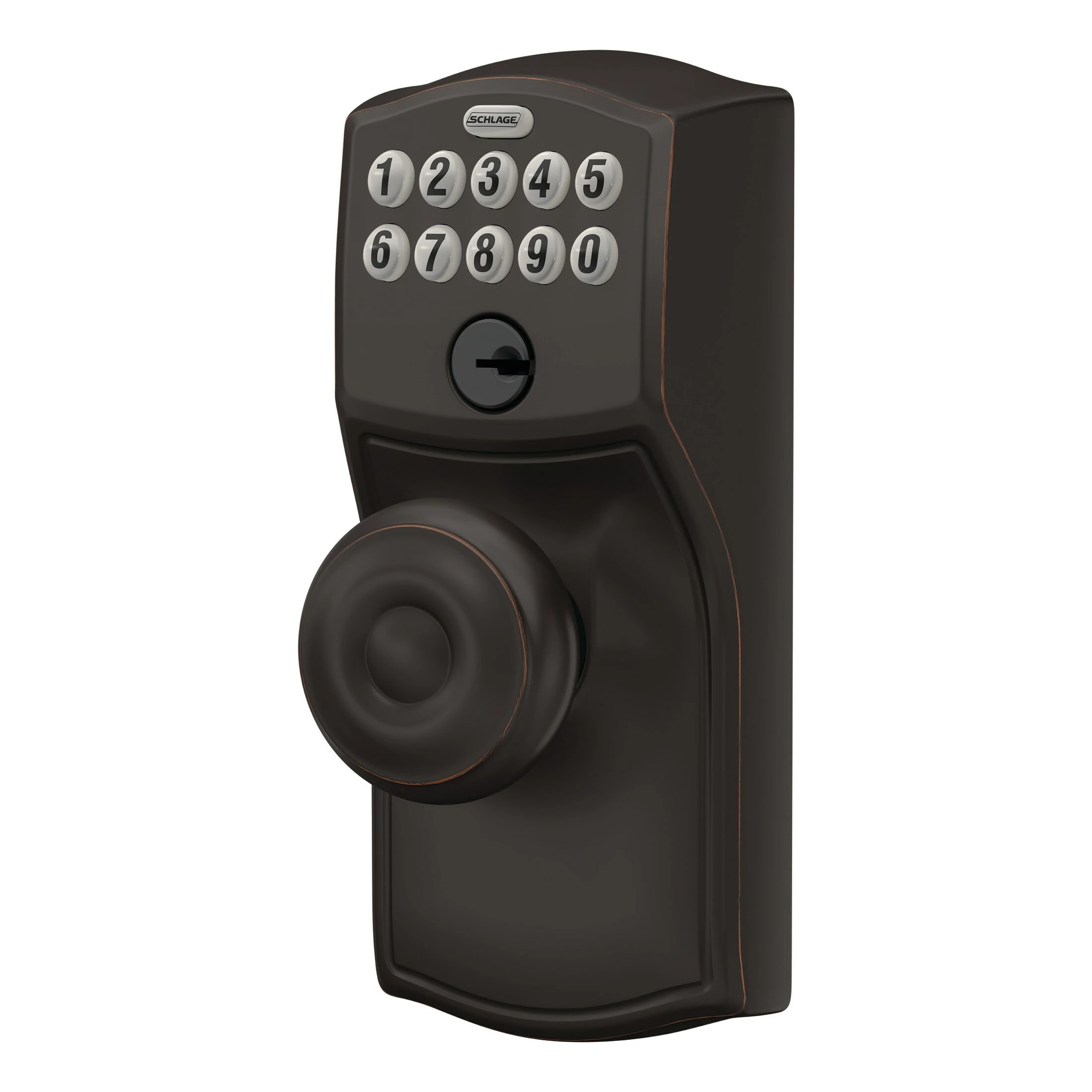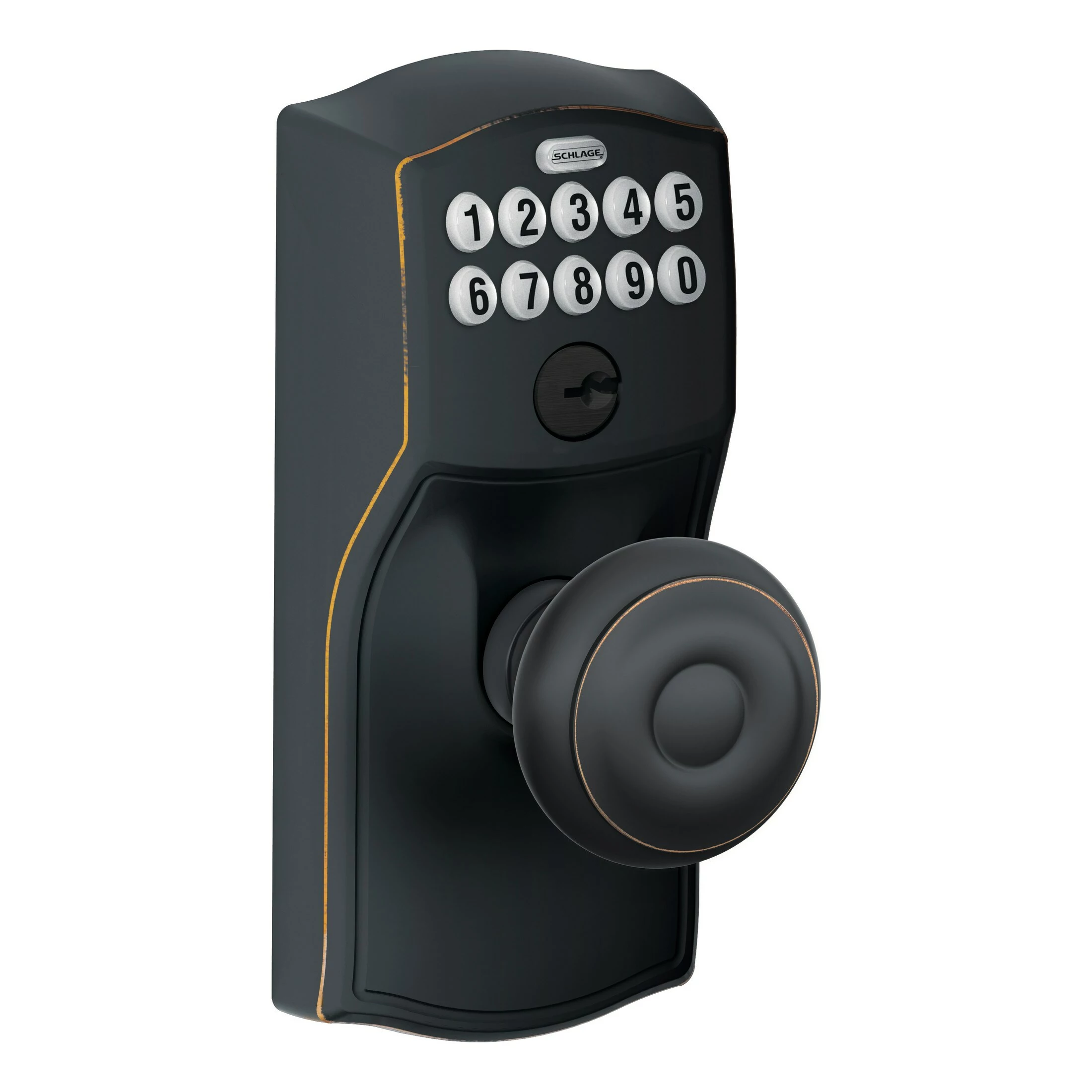 The Schlage Georgian Keypad Knob with Camelot Trim in Aged Bronze is perfect for use on front doors, garage entry doors, and side and back doors. With a keypad knob, you can control entry to your home more easily and securely, and our Flex – Lock feature allows you to set the lock to automatically re – lock after 5 seconds of inactivity. No more hiding keys under the doormat or losing track of copies – just use access codes that can be created or deleted in seconds. The modest Georgian knob features symmetrical detailing throughout, while the Camelot trim’s scalloped architectural details add charm to any home. Our Aged Bronze finish is inspired by traditional design, featuring warm, copper tones that break through its darker, aged exterior. Plus, it’s been designed and tested with strength and durability in mind.
