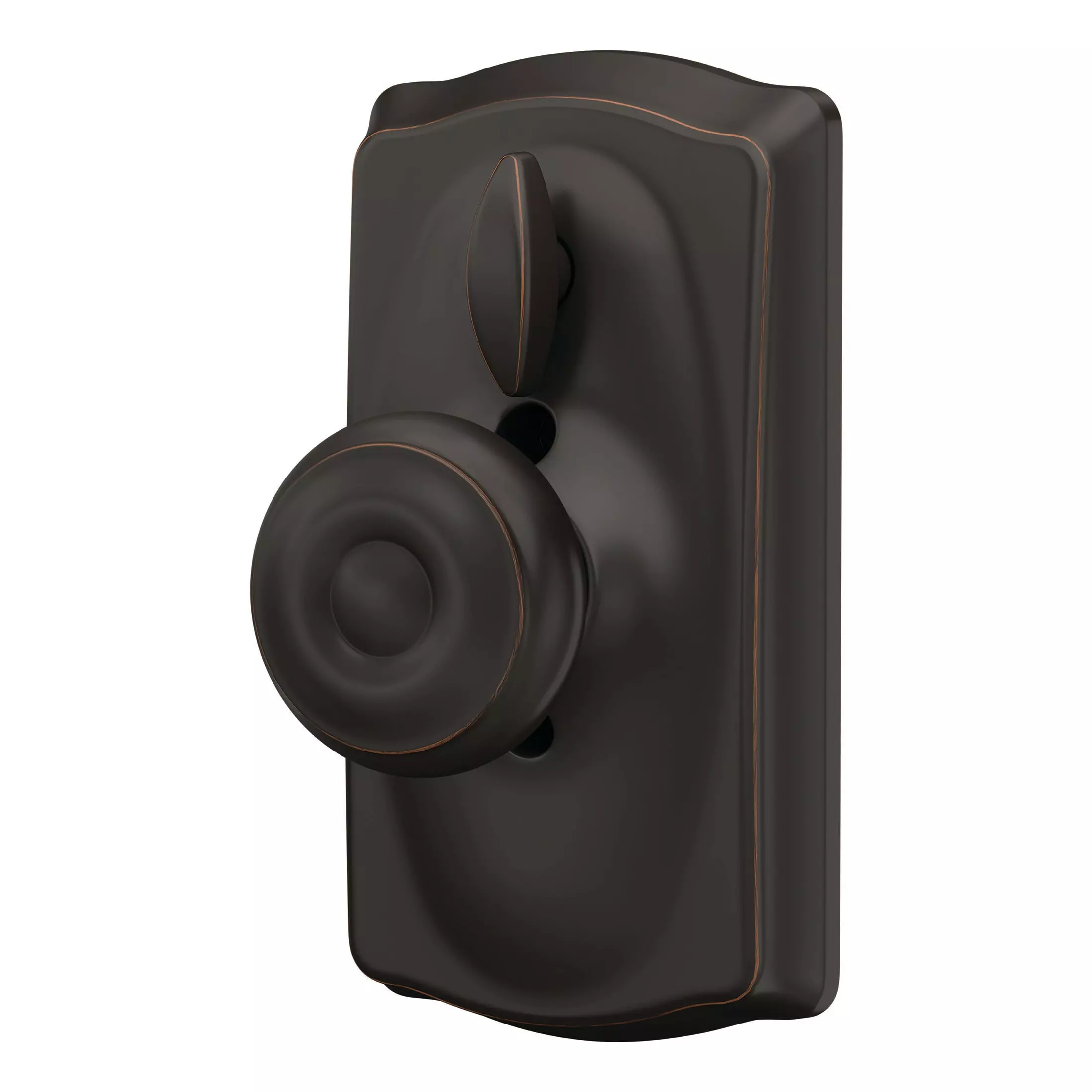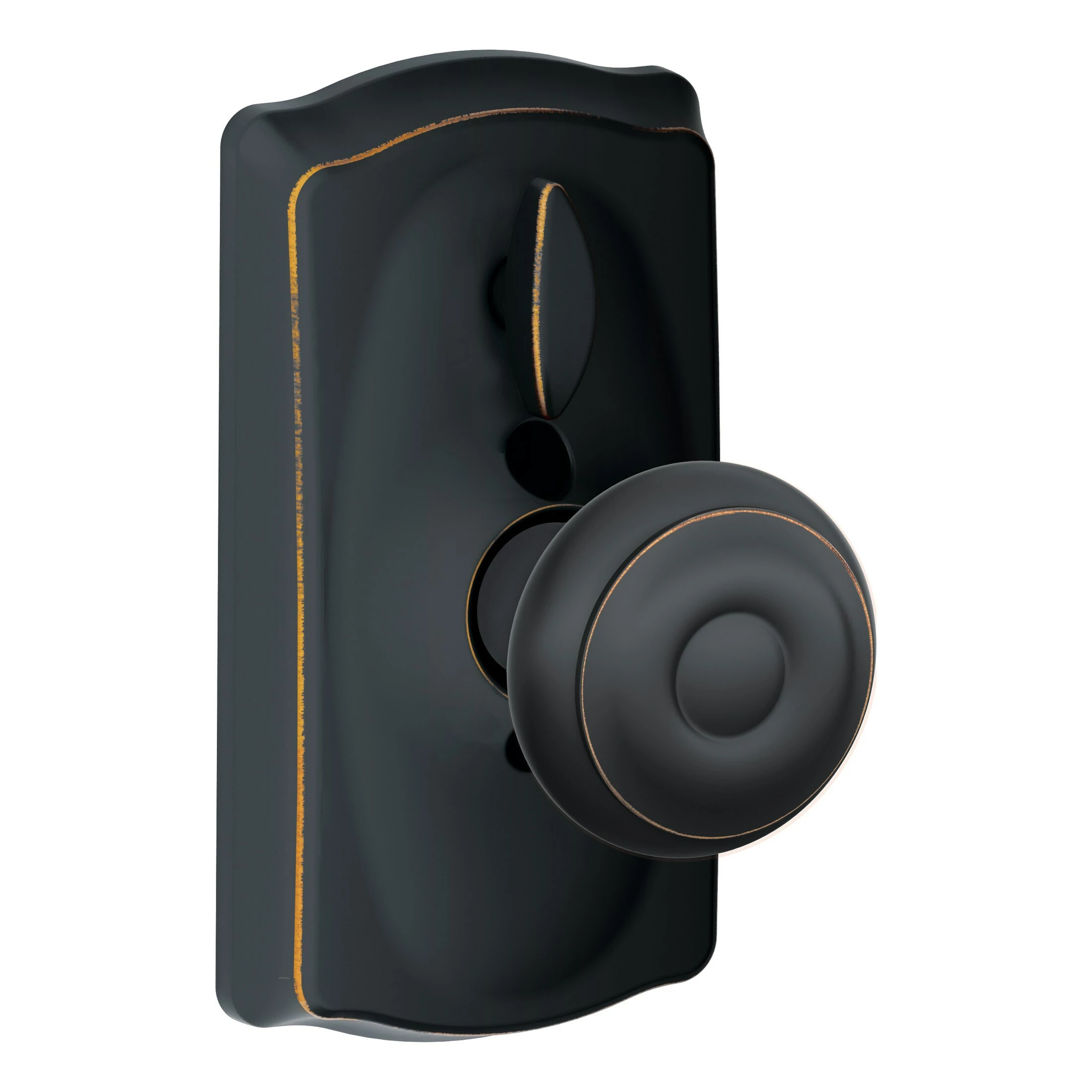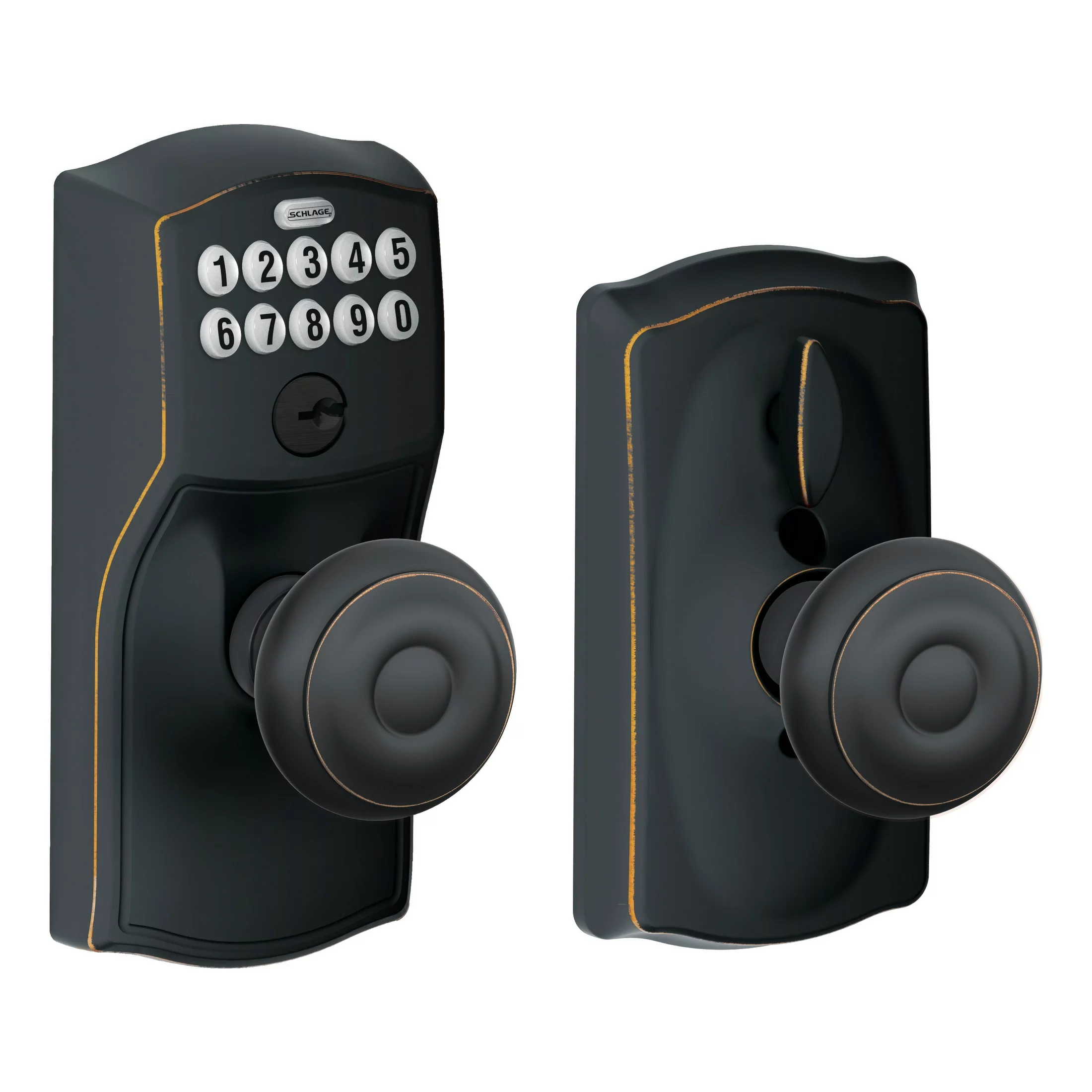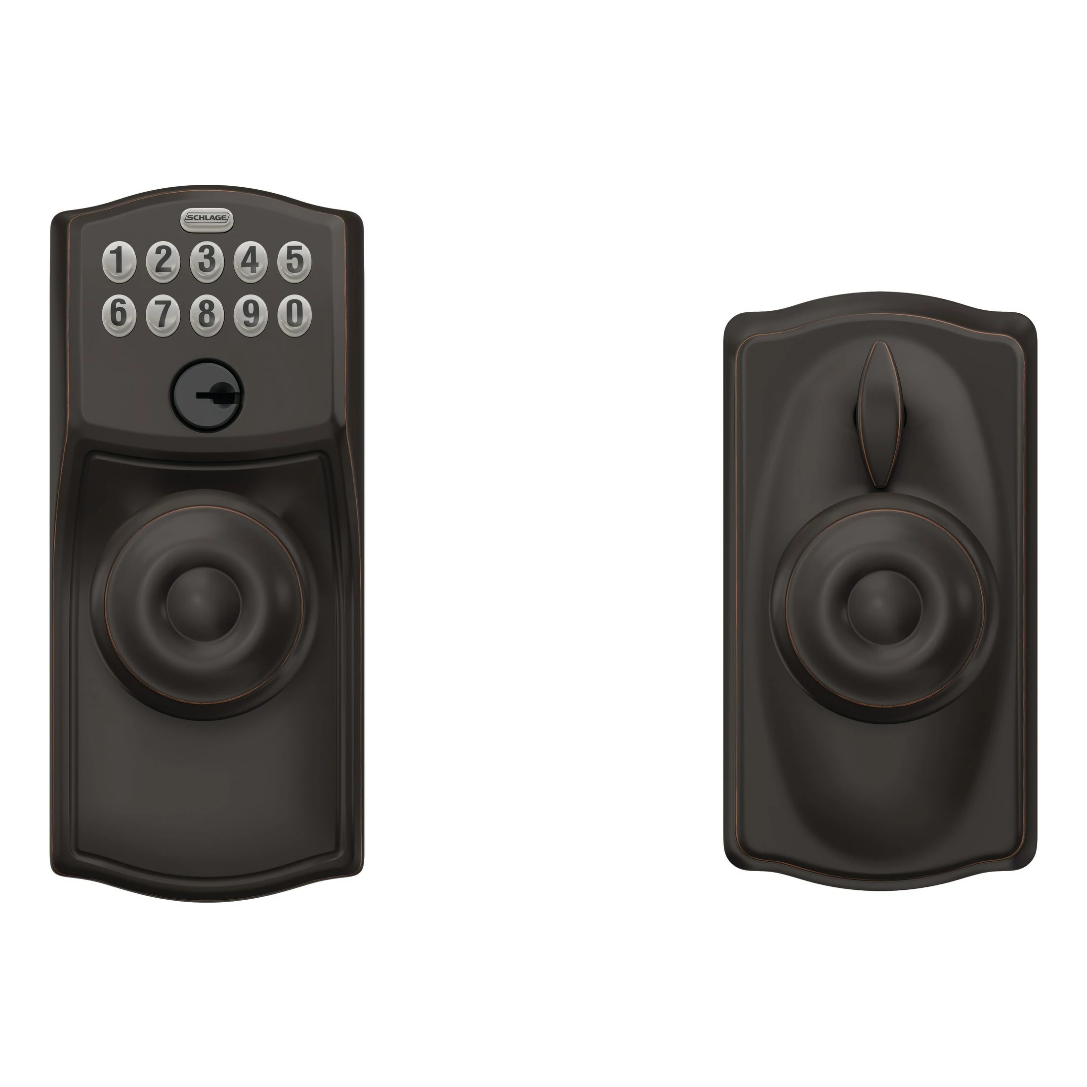 The Schlage Georgian Keypad Knob with Camelot Trim in Aged Bronze is perfect for use on front doors, garage entry doors, and side and back doors. With a keypad knob, you can control entry to your home more easily and securely, and our Flex – Lock feature allows you to set the lock to automatically re – lock after 5 seconds of inactivity. No more hiding keys under the doormat or losing track of copies – just use access codes that can be created or deleted in seconds. The modest Georgian knob features symmetrical detailing throughout, while the Camelot trim’s scalloped architectural details add charm to any home. Our Aged Bronze finish is inspired by traditional design, featuring warm, copper tones that break through its darker, aged exterior. Plus, it’s been designed and tested with strength and durability in mind.