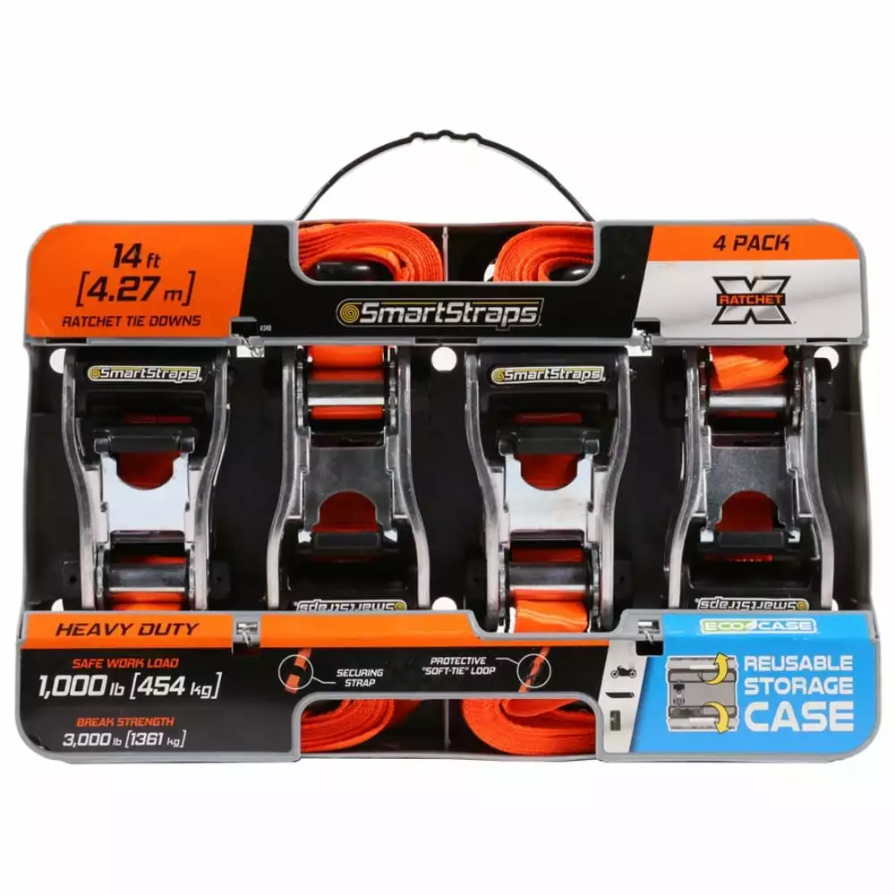 The RatchetX Ratchet Tie Down is stronger and more user friendly than standard ratcheting tie downs. They can be used for heavier loads often hauled in a large pick-up truck or on a medium trailer such as motorcycles, small boats or appliances. The SmartWeb™ technology provides webbing that is stronger and more abrasion resistant than standard webbing. The product has an innovative, robust flared out aluminum handle with padded grip for extra grip strength and leverage . It is packaged in our innovative, reusable EcoCase for easy storage.