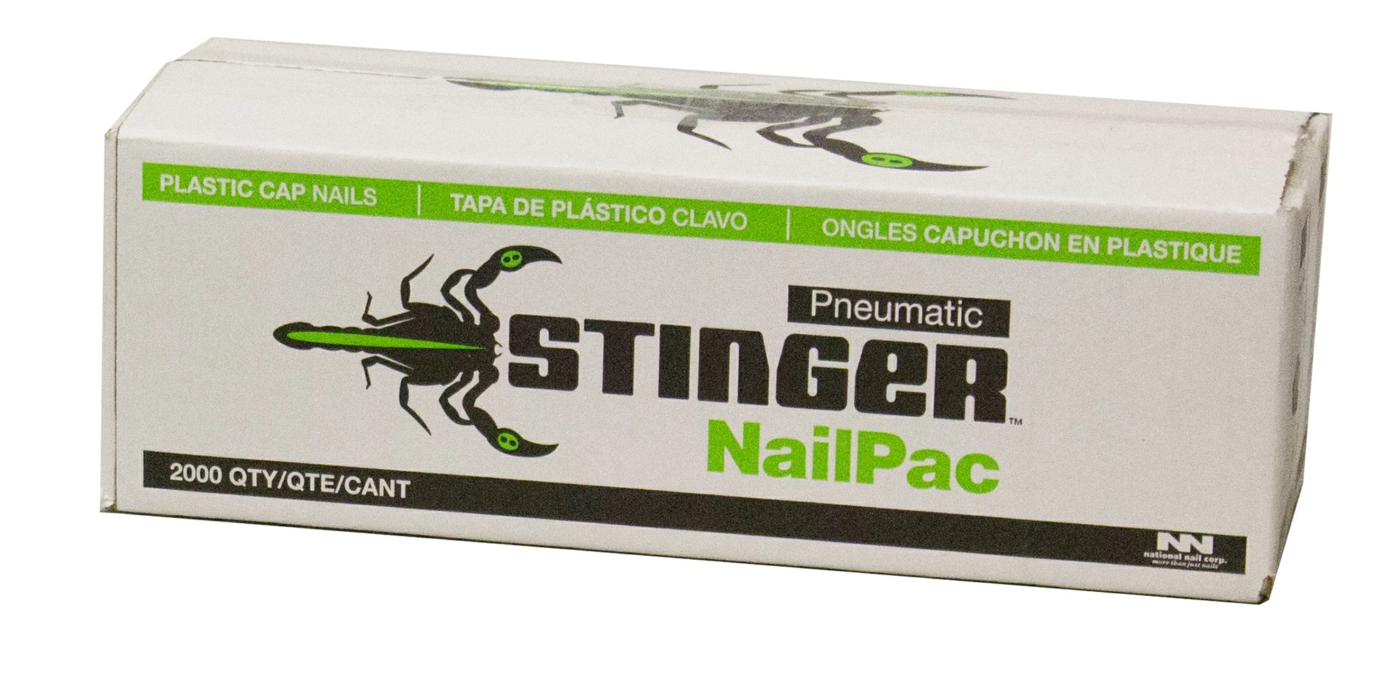 The Stinger 1 in. Nail Pac contains 10 rolls of 200 collated plastic caps and 10 coils of 200 nails. NailPac contains 1 in. collated caps and 1 in. nails. Cap nails are a recommended best practice for securing roofing underlayments of felt and house wrap where nails are required. The 1 in. NailPac is for use with the Stinger CN100B Cap Nailer only.