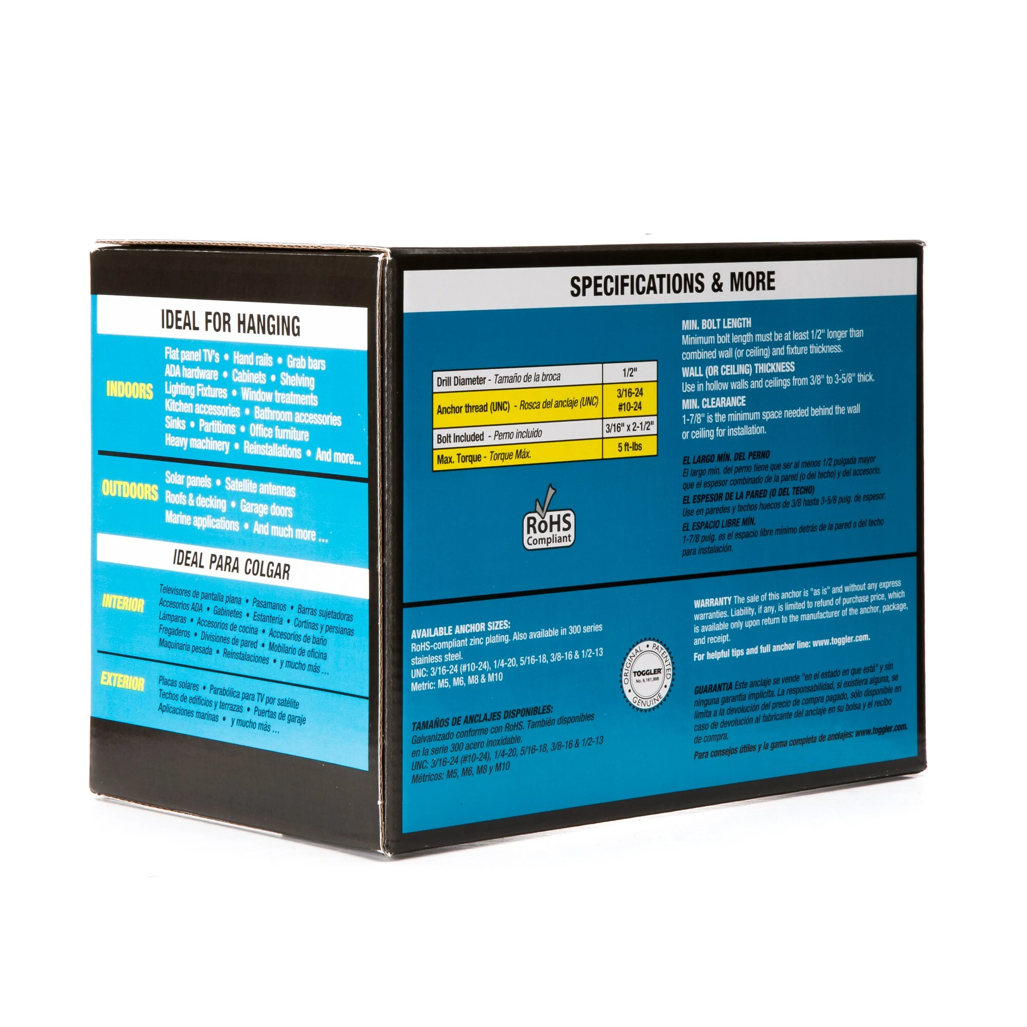 Strongest and most secure of all hollow-wall anchors. Holds up to two times more than wing toggles of the same bolt diameter: up to 802 Lbs. in concrete block and up to 238 Lbs. in 1/2-in drywall with 3/16-24 x 2-1/2-in bolt included in package. (Industry standards recommend 1/4 of this ultimate load per anchor. see our technical bulletin.) excellent also for use in ceilings. Resists vibration—the anchor’s solid metal channel centers the bolt in the hole and prevents it from damaging the wall or ceiling. Great for hanging flat panel TV’s, window treatments (curtains, drapes, blinds and more.), grab bars, hand rails, lighting fixtures, bathroom accessories, kitchen accessories, cabinets and more. Made in the USA.